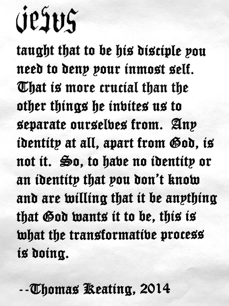 I want to be clear that when we speak of setting aside identity, what we’re talking about here is privilege and power. Countless folks through history and around the world today have been stripped of power and dignity, their identity ridiculed and dismissed. If you’re a person of color or a sexual minority or undocumented immigrant, you probably have some experience of this. No, what Fr. Keating speaks of–what Jesus spoke of when he called for followers to deny ourselves–is to sweep aside those self-interested glory stories that keep us from seeing the Messiah among us.