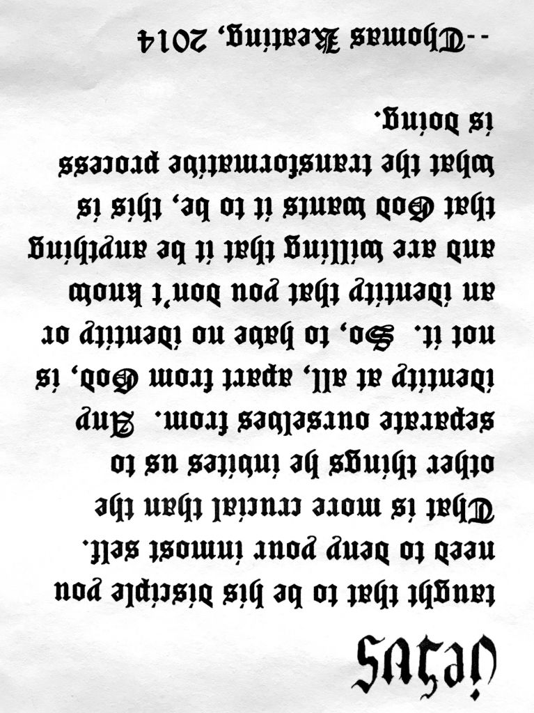 Now I’d like you to turn that hand-out upside down. The words become a jumble of unreadable, nonsensical symbols. Except–look at the bottom of the page. Who knew that with a certain font the name “Jesus” upside down becomes “Satan”! Some might find this offensive.