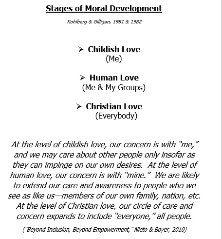 One way of describing moral development is to describe different kinds of love: Childish love, human love, and Christian love. We don’t gather on Sunday morning merely to improve our ability to love our own. We are here week after week for the sake of building our capacity to be the love of Christ in and for the whole world.